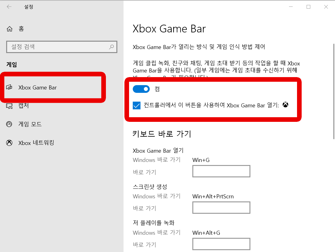 [Xbox Game Bar]에서 위 화면과 같이 [끔]이 되어 있다면 [켬]으로 바꿔 활성화를 시켜줍니다. 그리고 밑에 있는 [컨트롤러에서 이 버튼을 사용하여 Xbox Game Bar 열기] 도 체크해 줍니다.
