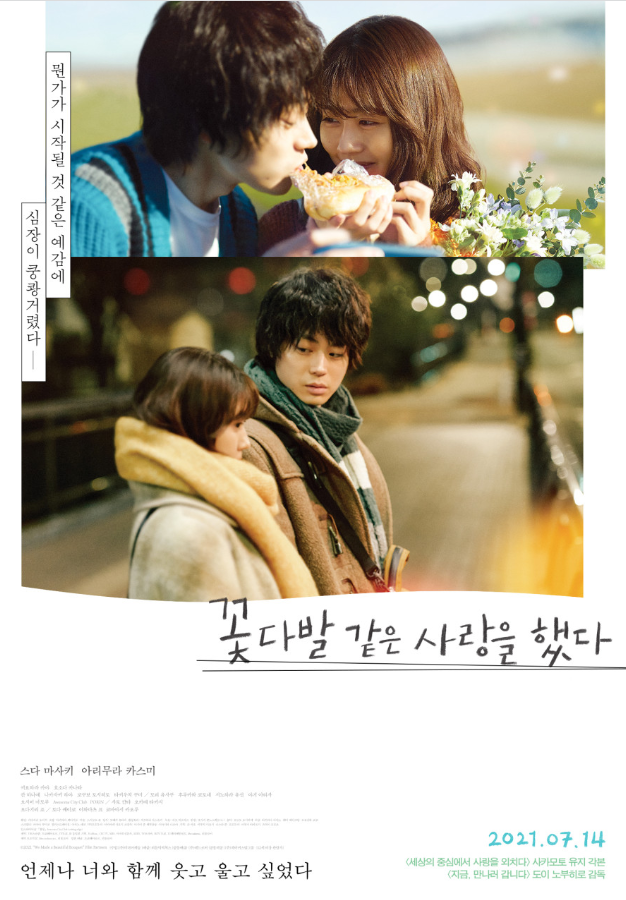 영화 [꽃다발 같은 사랑을 했다]는 일본의 로맨스 영화이다. 감독으로는 도이 노부히로이며 츠치이 토모에서 제작했다. 2020년도에 제작을 하였으며 21년도에 개봉했다. 일본에는 2021년 1월 29일에 개봉하고 한국에서는 2021년 7월 14일에 개봉했다. 일본 박스 오피스에서는 6주 연속으로 1위를 기록한 작품이다. 감독은 영화 '지금, 만나러 갑니다'의 연출을 맡기도 했었다. 각본은 '세상의 중심에서 사랑을 외치다'의 사카모토 유지가 연출했다고 한다. 출연배우로는 아리무라 카스미, 스다 미사키이며 두 배우를 중심으로 이루어지는 전개이며 각각 하치야 키누, 야마네 무기 역을 맡았다. 일본의 특유의 판타지적인 로맨스의 영화를 생각했다면 오산이다. 영화 [꽃다발 같은 사랑을 했다]는 매우 현실적인 사랑이야기를 담고 있다. 왠지 씁쓸하고 가슴 아픈 공감요소들이 잘 녹아있는 영화다.