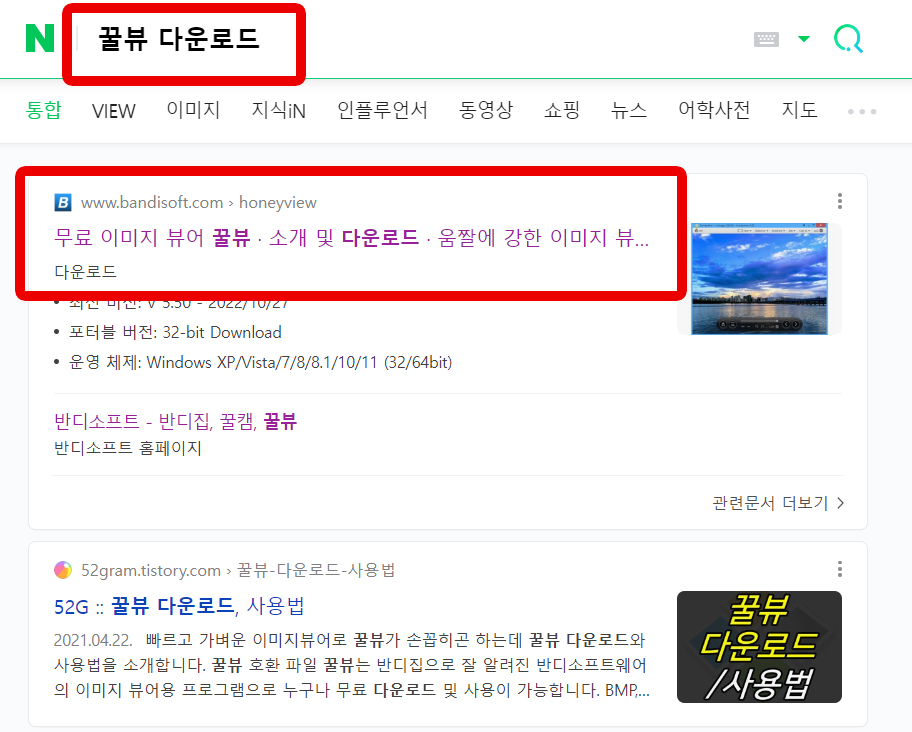 네이버 또는 구글에 [꿀뷰 다운로드]라고 검색합니다. 그리고 가장 밑에 있는 사이트를 눌러 들어가 줍니다.